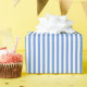 Lägg till en söt och charmig touch till dina presenter med detta blå och vitrandiga presentpapper. Perfekt för födelsedagar, baby shower, bröllop och mer, dess klassiska randiga design gör varje present ser förtjusande och festlig ut.