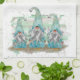 3 vattenfärgade akvatiska blågnomer på stranden med stjärnfisk på träbottnen i den västra grönten.
