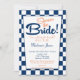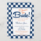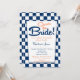 En söt marin och vit retro middag inbjudningskort för möhippan med en kontrollerad marin blå och vit bakgrund till "Shower the Bride".