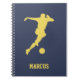 Den här blå anteckningsboken har en guldbild av en fotbollsspelare. Perfekt som födelsedags- eller julpresent till barn som älskar fotboll. Idealisk för läxor, dagboksskrivande etc. Använd designverktygen för att anpassa namn och teckensnitt.