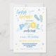 En rolig poolparty-inbjudan i en blå och gul färgskala med en randig design på baksidan. Perfekt för en pojkes sommarfödelsedagsfirande!