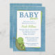 Sköldpadda Baby Shower-inbjudningar. En söt liten grön sköldpadda som sitter på ett blad. Perfekt för en liten pojke på väg! Grafik © www.scrappindoodles.com
