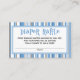 Här är ett alternativ för roligt för din barnduschskårsplanering. Bakgrunden till detta kort är förskönad med rand med en ny palett för dem som föredrar traditionellt blått för pojkar: det omfattar blues, taupe and white. På framsidan står "Diaper Raffle" som ett typsnitt som jag har lagt till som grafiskt överlägg. Under det där i ett versaler, avslappnad, redigerbart sans-serif-teckensnitt är det också redigerbara budskapet "Kom with diaper in packs of any storlek, and your name will be be in a chans to win a price!" Gör detta till vad du vill, om du vill förändra ord på något sätt. Under den gränsen står "Namn" från ord under den, och det finns gott om utrymme för att era vänner namn ska kunna skriva. Bakgrunden är täckt av det samordnande strippade mönster. Om du vill göra rand lite bredare klickar du bara för att anpassa... lagrar är olåst och kortet kan redigeras på nästan vilket sätt som helst som du kan tänka av. Och tveka inte att nå ut om du behöver hjälp. designad av Melody Watson för Pappra Muserie.