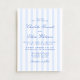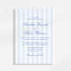Denna bröllopsinbjudan har ett mjukt blått och vitt vertikalt randmönster i kombination med elegant typsnittsstil. Den klassiska randdesignen ger inbjudan en tidlös och förfinad look, medan den ljusblå färgpaletten håller den fräsch och modern. Kombinationen av rena ränder och flytande typsnitt skapar en balanserad stil som känns både traditionell och modern.