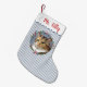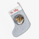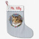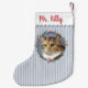 Fira jul med din söta katt med denna charmiga julstrumpa för katter som har ett klassiskt blått randmönster. Accentuerad med en grön krans med röda bär och en trendig kant med vågig kant, kommer denna design att lägga till en charmig touch till din braskamin. Lägg till din katts namn och foto för att skapa ett unikt tillskott till din juldekoration. Häng den vid braskaminen eller kaminen och fyll den med godsaker till din lurviga vän under julen. Gör en fin present till kattälskare.