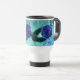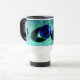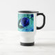 Droppar från vatten vid ett löv efter regn som var alienerat till ett blått färg. Ett makrofoto av regn faller av Katho Menden. Denna resemugg är en presentidé för älskare. http://www.zazzle.com/kathom_photo