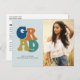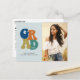 Denna roliga examenskort har ett modernt uttryck med influenser från vintage 1970-talsdesign. Framsidan av kortet har 70-tals typografi till vänster och ett vertikalt foto till höger. Den retrotypografiska texten "Grad" är i nyanser av marinblått, bränt orange, skördeguld och akmarin-grönt på en ljusblå bakgrund. Den examinerades namn och skola är skriven under typografin och examensåret är skrivet tvärs över D:et i "Grad". På baksidan kan du lägga till ett meddelande till mottagarna och/eller information om examensfesten.