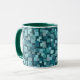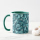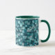 Blå, akvatiska och teala fyrkanter dekorerar detta retro stil-kaffe mugg. Designen kommer från originalteckningen.