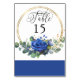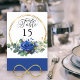 Bordsnummer kort med elegant-kalligrafi, blå ro och blommor, eukalyptus löv och grönenergi. Den arrangemanga blommigten ställs in i en guld-geometrisk cirkel i ram. Samordnande inbjudningar, kontorsprogram och händelseavkännare finns i min samling Ro och Eucalyptus Quinceanera eller, kan du meddela mig att du vill lägga till de designmallar du behöver.