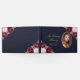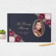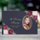 Anpassa enkelt den vackra blåa och guld-blommigten till att älska minnet/begravningsgästen bok med ett foto med burgundrött och rosa ros och baby utandningsblommor med mörk blått bakgrund.