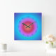 En atmosfärisk blå/aqua cirkeldesign med en glödeffekt. Mitten av klockdesignen är rosa och persika. Denna trendiga klocka har mörkblå siffror. Anpassning ändrar formen till rund. Visarna finns även i silver. Observera: Detta är inte en LED-produkt, endast tryckt design.