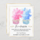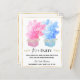 En budgetvänlig inbjudan till babykalas eller könsreveleation. Mot en vit bakgrund består designen av rosa och blå överraskningslådor, märkta "fröken" och "herrn", med eleganta blå och rosa rökmoln som bryter ut, och guldpynt. Barnets efternamn skrivs i den vita texten inom röken. Texten lyder "det är en fest, var vänlig och kom till en liten fröken eller herrns könsreveleation". Personalisera genom att lägga till hela din evenemangsinformation och kontaktuppgifter på framsidan och baksidan.