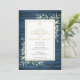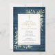 Med känsliga akvarellgröna blad på en blå rustik träbakgrund och ett elegant guldkors, kan denna snygga inbjudan till första heliga kommunion anpassas med din speciella information. Designad av Thisisnotme