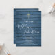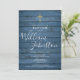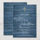 En rustik dopinbjudan med ett elegant guldkors och underskrift namn i typsnitt på en blå träpanel bakgrund. Personifiera med din speciella dopinformation i chic typografi. Designad av Thisisnotme©
