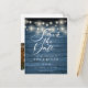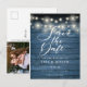 Detta rustika kort för att spara datumet har vackra strängljus och ett elegant manus för att spara datumet ovanför dina detaljer, satta i elegant typografi på en rustik blå träpaneler bakgrund. Baksidan visar ditt speciella foto och har ytterligare detaljer för att spara datumet, inklusive din bröllopswebb QR-kod, med din returadress och utrymme för din mottagares adress. Designad av Thisisnotme