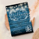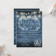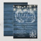 En rustik bröllopsinbjudan med vackra strängljus, murade krukor och en delikat handritad rustik blomsterkrans av botanisk bladverk med stilfull skrifttypografi, på en blå rustik träbakgrund. Anpassa med din speciella bröllopsdagsinformation. Designad av Thisisnotme