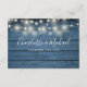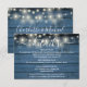 En rusticerad informationskort för bröllopsdetaljer med vackra strängljus och blå träpaneler i bakgrunden. Anpassa med dina speciella detaljer i stilfull typografi och era namn och bröllopsdatum på baksidan. Designad av Thisisnotme