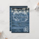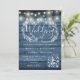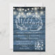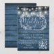 En rustik bröllopsinbjudan med vackra strängljus, murade krukor och en delikat handritad rustik blomsterkrans av botanisk bladverk med stilfullt skript-typografi, på en blå rustik träbakgrund. Personifiera med din speciella bröllopsdagsinformation. Designad av Thisisnotme©