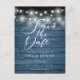 Denna rustika spara-datum-kort har vackra strängljus och ett elegant manus spara datum ovanför dina detaljer som är satta i elegant typografi på en rustik blå träpanel bakgrund. Baksidan har ytterligare detaljer om spara-datum, inklusive din bröllopswebbplats QR-kod, med din returadress och utrymme för din mottagares adress. Designad av Thisisnotme
