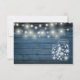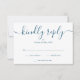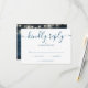 Ett enkelt elegant signaturskript RSVP-kort med dina detaljer i chic blå typografi och blå rustika träpaneler, stränglyktor och murarljus på baksidan. Designad av Thisisnotme