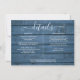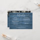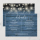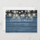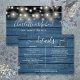 En elegant informationskort för bröllopsdetaljer med strängljus, personligad med era speciella detaljer i stilfull typografi och era namn och bröllopsdatum på baksidan mot en rustik blå träbakgrund. Designad av Thisisnotme©