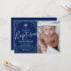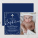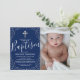 Inbjudningskort för pojkars dop/dop med en marinblå bakgrund som kan ändras till valfri färg, elegant spridd silverglitter, ett religiöst kors, ett foto av ditt barn och en modern textmall som är enkel att anpassa.