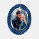 På den här söten Första julprydnaden tar ditt eget foto en mittpunkt i en glansig silver-cirkel ram, som placeras på en mörk blått bakgrund med ett övertäckt av silver hjärtat mönster. Baksidan av dekorationen har samma bakgrund och silver ram, med texten i anpassningsbarna i två fält i samma blå form. Säg spelar ingen roll att du vill!