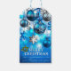 Detta är en stilfull dekorativ julklappsetikett med blå, vita & silverfärgade julgranskulor, godisrand, stjärnor, pärlor, band och julgran.