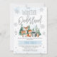 Söt blå och silver skog vinter på en plats tema första födelsedag inbjudan med fyra söta skogsdjur, några tallar, en blå banner, en dekorativ silver glitter rubrik och snöflingor. Denna pojkes skog vinter på en plats födelsedag inbjudan har också några silver glitter prickar och en randig blå och silver baksida.