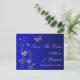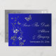Detta kungliga blå, marinblå och silvergrå blomsterformade spara datum-postkort har fjärilar och blommor som matchar den bröllopsinbjudan som visas nedan. Om du behöver andra matchande föremål i denna design, vänligen maila din förfrågan till niteowlstudio@gmail.com.
