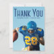 Tack skriven i hög blå typografi över ditt höga foto från porträtt student gör ett enkelt studenten-tack för en fotbollsspelare i ett idrottslag. Anpassa med ditt namn och klass 2023 på dessa minimalistiska textöverlägg med student-kort. Skriva ett personlig tackord på baksidan.