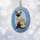Här är en söt siamesisk katt som julprydnad som gör ett fint tillägg till ett hushåll som kärlek a Siamese! Utsmyckningens framsida har en söt vattenfärgsbild av en blåögd siamesisk katt sitta framför en ljusblå oval med en blå och vit snöflinga gräns. Baksidan av dekoratet har samma snöflinga gräns och blå ovala, med anpassningsbarnas text i motsvarande blått. Säg spelar ingen roll att du vill!