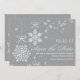 Meddela dina kommande påhopp med den söt bleken eggshell blue och grått snowflake spara datumkorten och meddelandena med ett par snöflingor och ljusblått rosett band och hjärtformade reflektioner från snö på kortets framsida. Lägg till din egen kärlek-berättelse i baksidan av vinternettemat sparat datumet. Art © Chrissy H. Studios, LLC. Alla Höger reserverade.