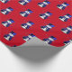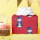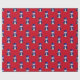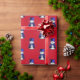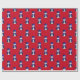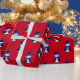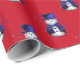 En vit papper omslutning med ett sött snögubbe klädd i en blå sammet top hat och väst, omgiven av blå stjärnor på en röd bakgrund till jul.