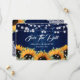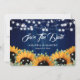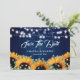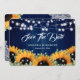 Rustic navy blue and sunsun bröllop spara datum card med solblommor, baby andedräkt och eukalyptus på en rustik träbakgrund adorterad med strängen ljus.
