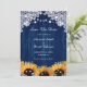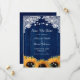 Rustic navy blue and sunsun bröllop spara datum card som innehåller solrosblommor, baby utandning och eukalyptus mot en bakgrund av rustiskt trä.