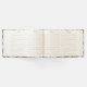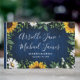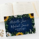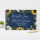 Blå solrosblomman Rustic Bröllop Guest Bok - har en marin blå lada-bakgrund som dekoreras med daisy för vattenfärg, solblommor, grönsak, baby utandning och lilja av dalen.