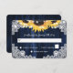 Romantiskt bröllop OSA för marin blommigt med solblommor, vit blommigt snöre och sträng ljus mot en bakgrund av rustiskt trä. Utformning av perfekt-kort som komplement till din marinblå rustiska bröllopsfest som inspirerats av solrosblommor.