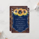 Blåblommig bröllopsinbjudan med solblommor och snöre ljus mot en rustisk blommigt.