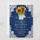 Rustic navy blue blommigt bröllopsinbjudning med solros och baby utandning bouquet inuti en mason burk på en rustik träbakgrund som är försedd med vit blommigt snöre och sträng ljus. Utformning av perfekt för att bjuda in dina gäster till ditt marinblå landsbyggsbröllop party inspirerat av solblommor.