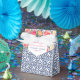 Ett modernt, klassiskt favoritfack för bröllop med en bakgrund av mörk blått och vita vintagar. Detta mörk blått är perfekten färg för att visa upp levande vattenfärgblommor i rosa och citrusfrukter i orange.