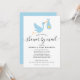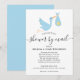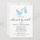 Blå babypojks-stänk från fjärran via post inbjudan med en söt blå stork som bär en speciell guldfjärdelsleverans, på vit bakgrund, denna söta baby shower, stänk eller par-stänk via post inbjudan är perfekt för alla småttingar som är på väg. Lägg till din speciella evenemangsinformation i elegant text för att skapa den perfekta inbjudan. Designad av Thisisnotme©