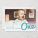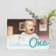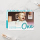 Denna dubbelsidiga födelsekort för babypojke till hans första födelsedagspartaj innehåller en modern och djärv typografisk skiss 'one' titel skript i turkosblå färg som överlappar ett foto med en matchande baksida. Inbjudans anpassade text finns på baksidan av kortet i en enkel layout.