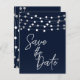 Blå strängljus Modernt manus Spara datumet vykort. Anpassa med valfri text.