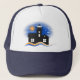 © Sunny Mars Designs - Truckerkepsar för Anpassade av fyr-Sjölandskap - manar av Coola anpassningsbar eller kvinnors kuststrand som har en kustbild av en fyr-silhuett på kusten med sol, fiskmåsar och vinkarare som representerar sand och hav.