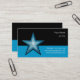 Modern design med en "strålande, mousserande" blå och vit stjärna på en svart och blå bakgrund. Affärskortsmall som är utformad för att du ska kunna anpassa anpassadet med egen text, bilder och egna idéer. Observera att det här är en tryckt bild som skapats med originalfotografier och digitala tekniker. Den skiner inte eller innehåller riktiga miniatyrbilder.