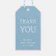 Lägg till en personlig touch till dina baby shower-favoriter med denna eleganta presentetikett med mjuka blå toner och vit “Tack” text med den blivande mammans namn. Perfekt för att knytas på påsarna, lådorna eller partisfavoriterna, matchar denna etikett vackert med andra föremål i kollektionen. En enkel, modern design perfekt för en baby boy shower med kust-, strand- eller nautiska vibbar.