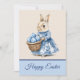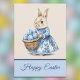 Detta charmiga påskkort har en "mor" kanin i en toile, eller Chinoiserie, stil blå och vit klänning som håller en korg med blå och vita dekorerade ägg. Kortet säger "Glad Påsk" på framsidan och "Önskar dig en korg full av varma önskningar för påsksäsongen" på baksidan, tillsammans med en korg med dekorerade ägg. Du kan redigera texten eller göra andra ändringar.