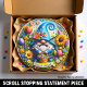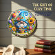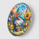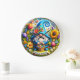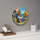Den här livfulla runda väggklockan har en fantasifull digital illustration i 3D-stil av en glad tomte som firar vårens ankomst. Tomten bär en klarblå texturerad mössa med en lekfull spiralspets och håller i en flätad korg som svämmar över av färggranna vårblommor. En vacker samling överdimensionerade blommor, inklusive en gyllene solros, rosa tulpaner och lila lavendel, omger tomten i en frodig blomsterkrans. Längst ner visar ett vitt pergamentband den vänliga hälsningen "HELLO SPRING" i feta blå bokstäver. Designen är satt mot en mjuk himmelblå bakgrund med små fjärilar och gnistrande accenter. Denna funktionella heminredning är en perfekt säsongspresent, perfekt för att lysa upp ett