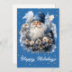 Unikt julkort med en vintageinspirerad tomte i blå dräkt med vacker vinterblomma och en stjärnklar himmel som bakgrund. Personliggör din hälsning med anpassningsbar text. Denna digitala konstdesign skapades med hjälp av AI-programvara.